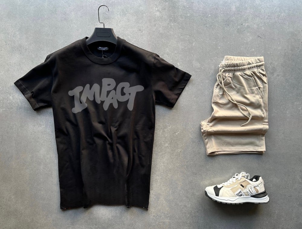 طقم رجالي قطني تيشيرت اسود + شورت بيج