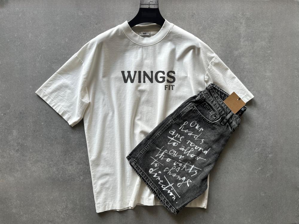 أضف لمسة نظيفة وكاجوال لإطلالتك مع طقم رجالي أنيق مكوّن من تيشيرت أبيض أوفر سايز بتصميم Wings العصري، وشورت جينز خفيف بكتابة جانبية تضيف حركة مميزة للستايل.
